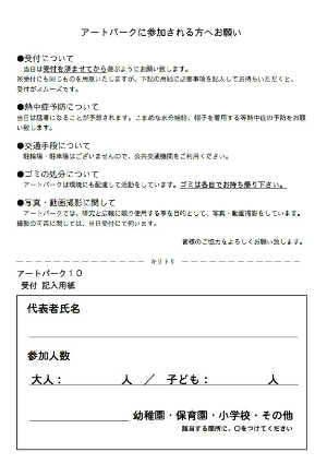 ※受付にも受付記入用紙がございますが、アートパークのチラシ(裏面)をダウンロード後プリントアウトし、必要事項を記入してお持ちいただくと、受付がスムーズです。