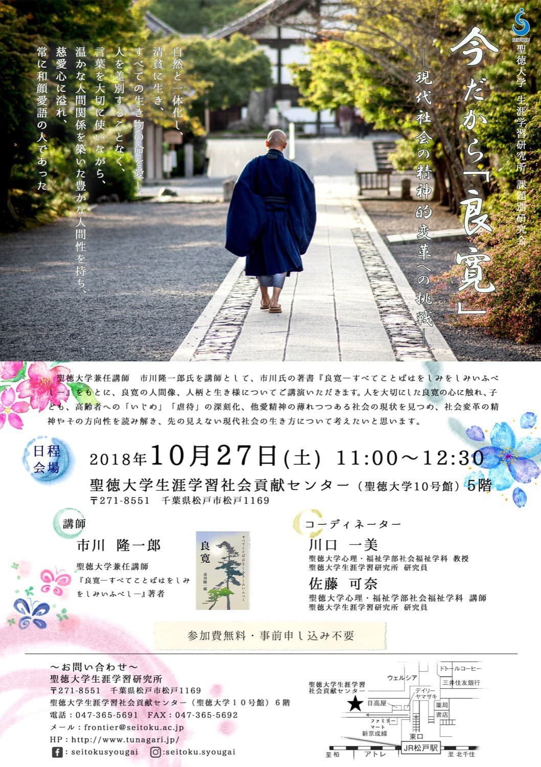本研究会では、聖徳大学兼任講師 市川隆一郎氏を講師として招聘し、市川氏の著書『良寛―すべてことばはをしみをしみいふべし―』をもとに、良寛の人間像、人柄と生き様について講演いただき、人を大切にした良寛の心に触れ、子ども、高齢者への「いじめ」「虐待」の深刻化、他愛精神の薄れつつある社会の現状を厳しく見つめ、社会変革の精神やその方向性を読み解き、先の見えない現代社会の生き方について考えていきたい。本研究会を通して、現在の自身の生活や生き方を改めて見つめ、今後何を拠り所として生きていくか考える機会にしたいと考える。