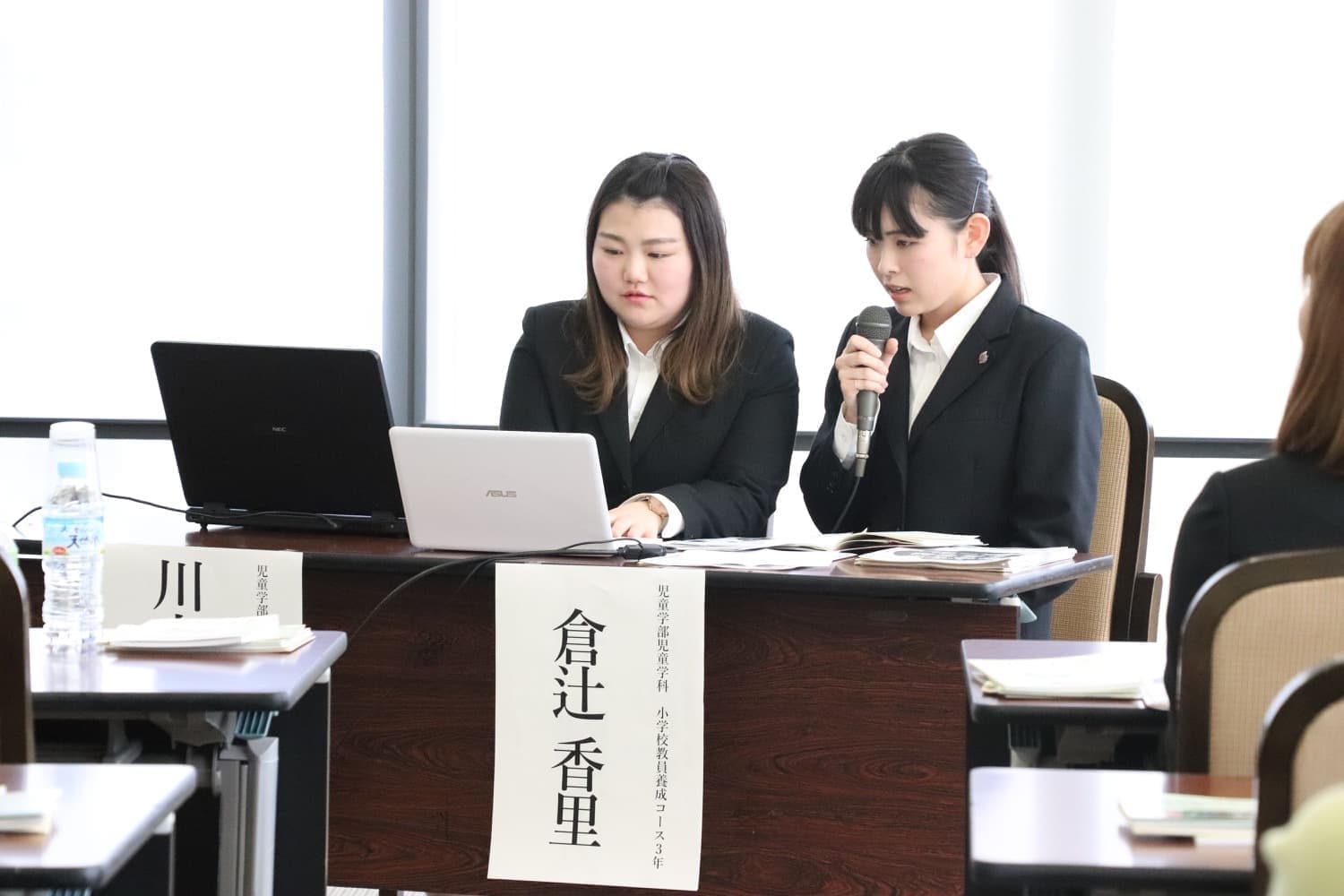 学生の発表は、「アートパーク」に参画した4年生澁谷澪那さん(現小学校教員)小野佳奈恵さん(現公立保育士)の大成ゼミコンビの活動報告。「ジュニア夢カレッジ4」の学生リーダーを務めた3年生川上眞喜乃さんと倉辻香里さんの二人からは、企画・運営・協力者の社会人との交流から、いかに自分たちが成長したかの振り返りを、元気に発表。生涯学習研究所助手(現講師)有川かおり先生のコーディネートのもと、会場から多くの質問も出ました。