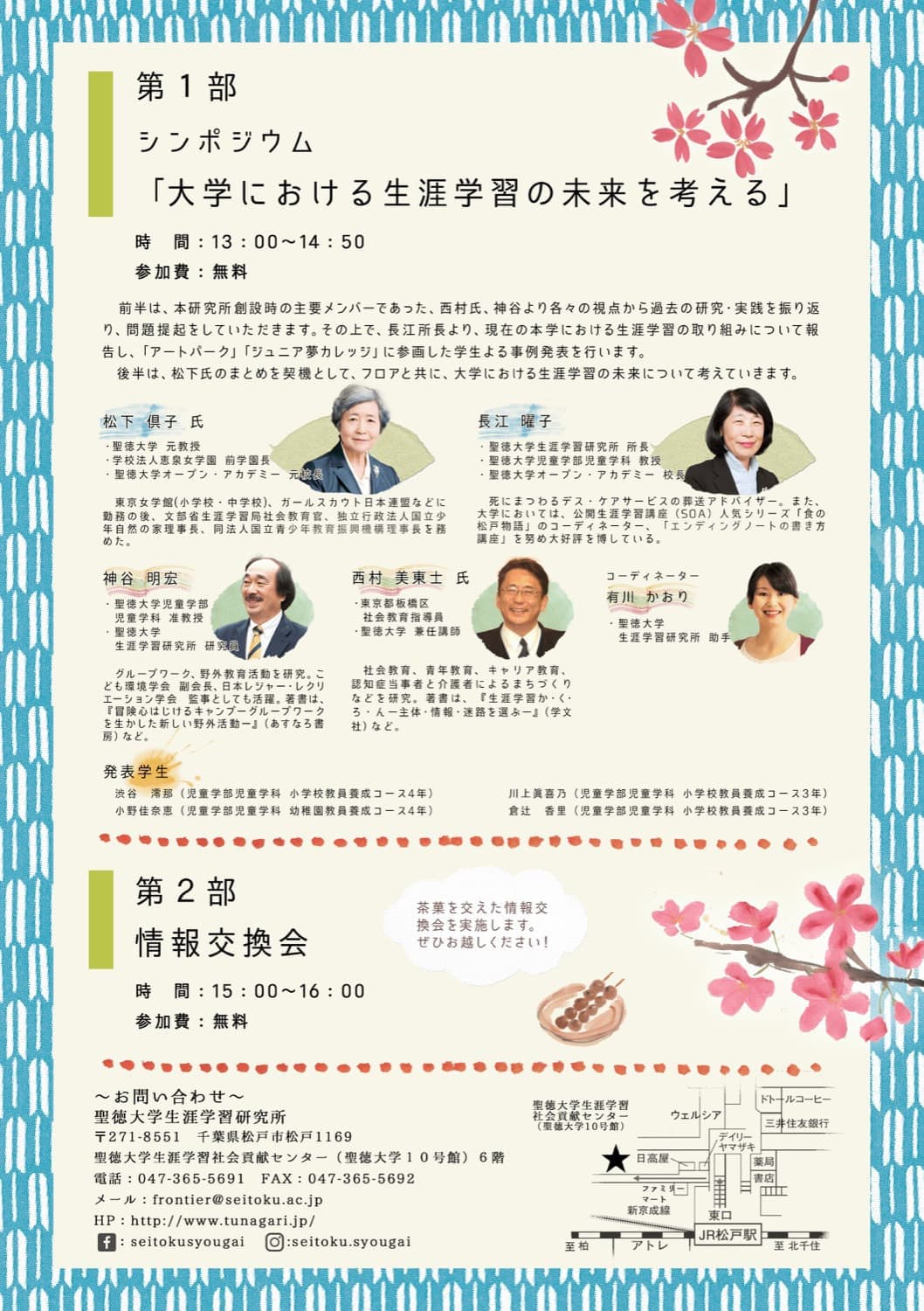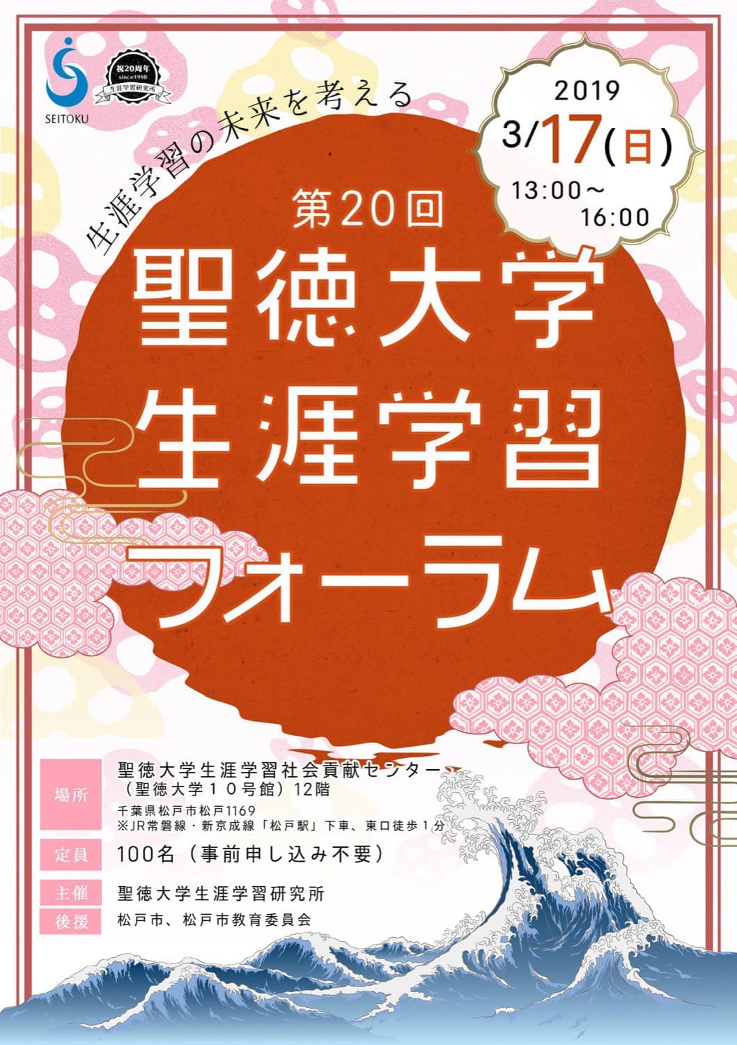 去る3月17日(日)13:00より聖徳大学社会貢献センター(聖徳大学10号館)12階で、第20回聖徳大学生涯学習フォーラムが開催されました。