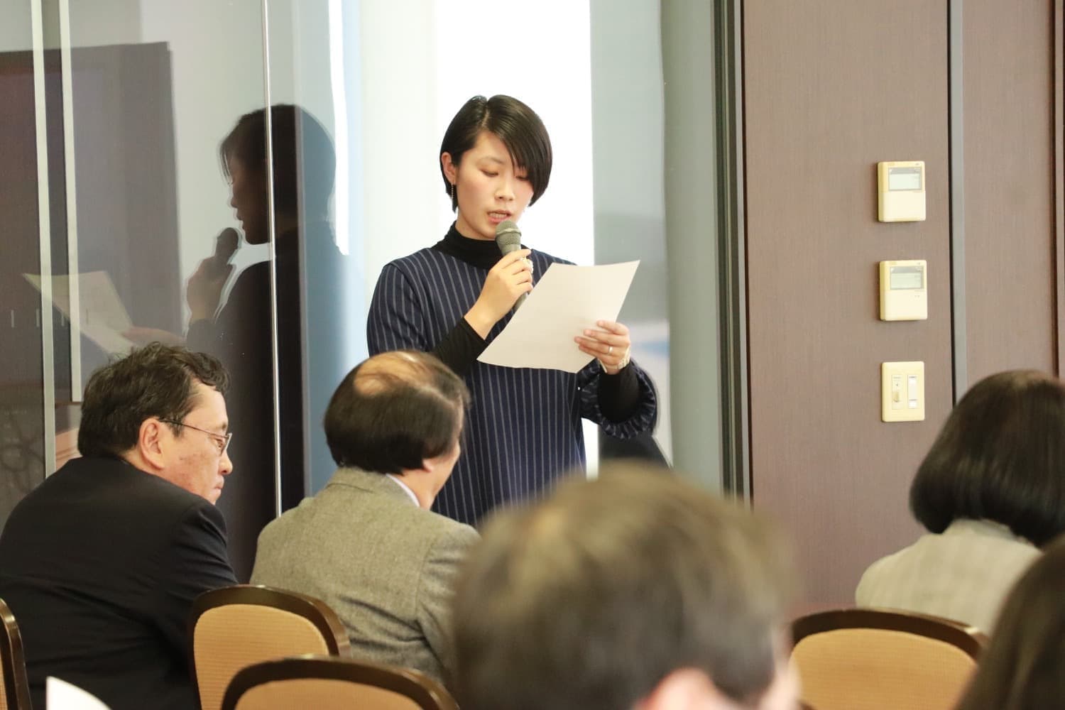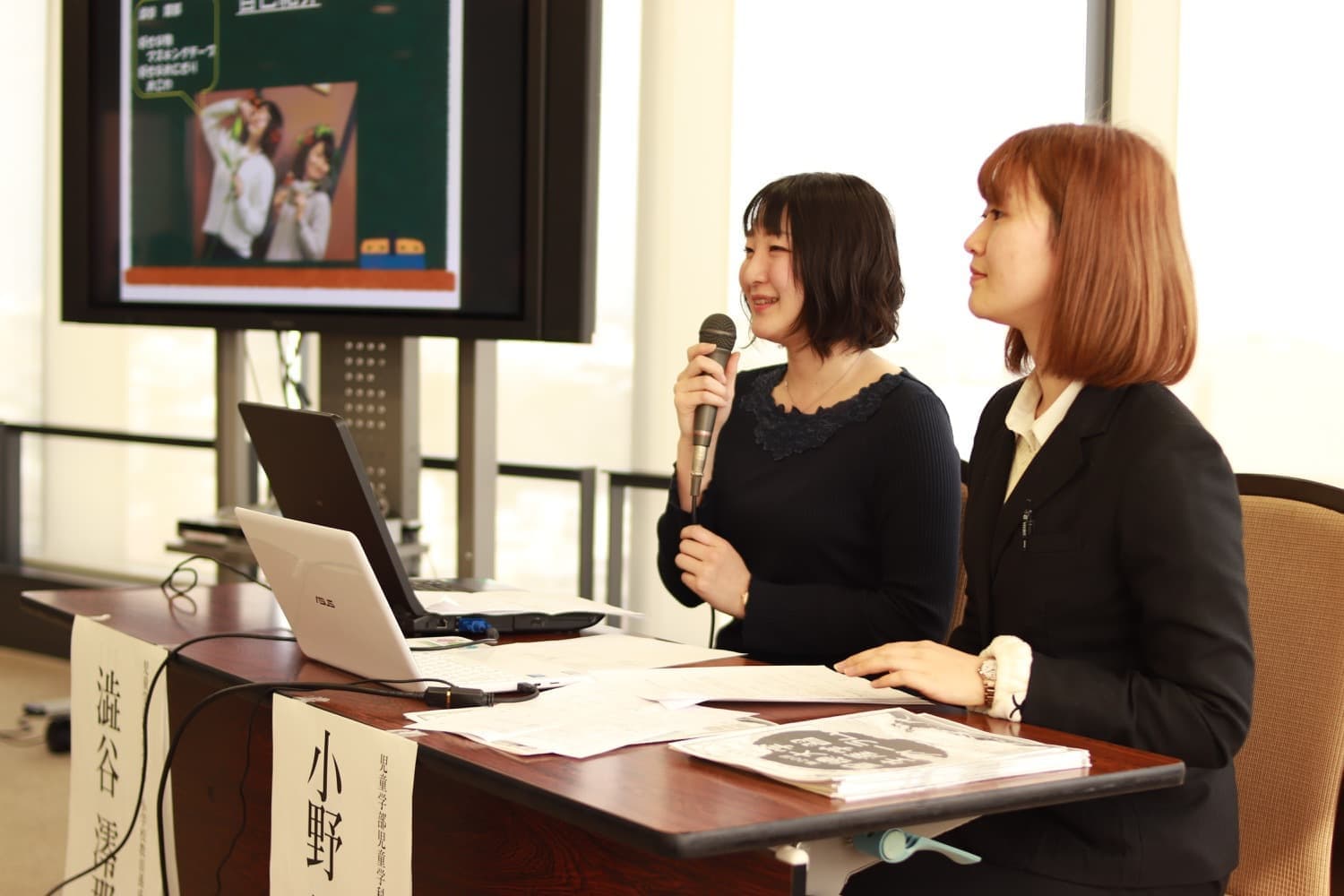 学生の発表は、「アートパーク」に参画した4年生澁谷澪那さん(現小学校教員)小野佳奈恵さん(現公立保育士)の大成ゼミコンビの活動報告。「ジュニア夢カレッジ4」の学生リーダーを務めた3年生川上眞喜乃さんと倉辻香里さんの二人からは、企画・運営・協力者の社会人との交流から、いかに自分たちが成長したかの振り返りを、元気に発表。生涯学習研究所助手(現講師)有川かおり先生のコーディネートのもと、会場から多くの質問も出ました。