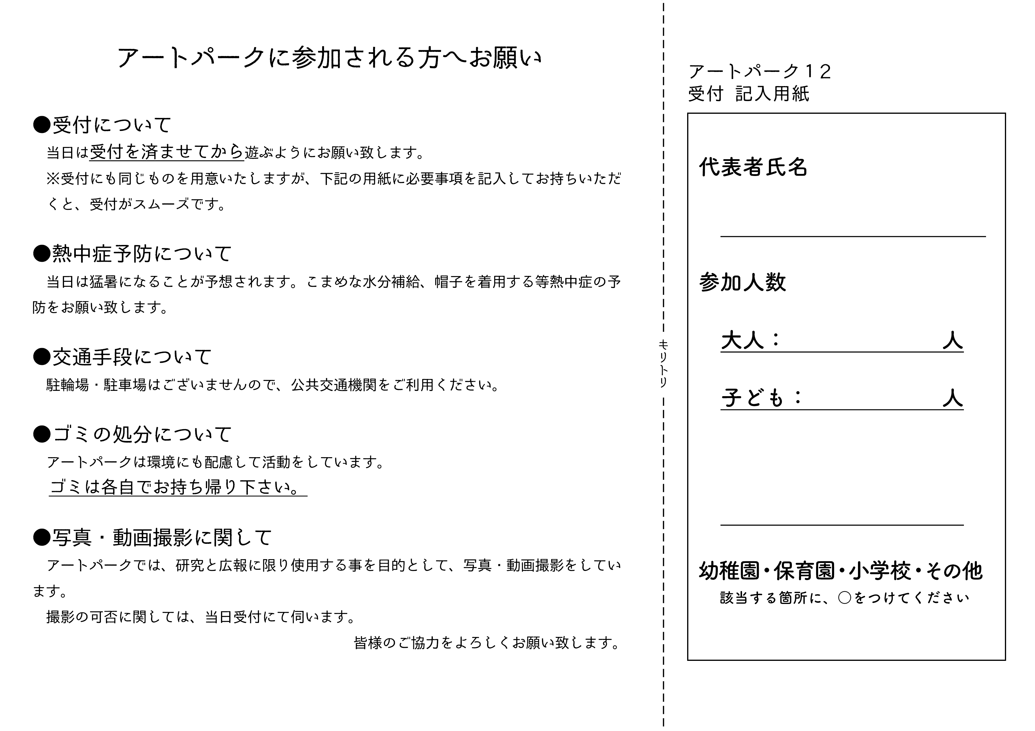 ※受付にも受付記入用紙がございますが、アートパークのチラシ(裏面)をダウンロード後プリントアウトし、必要事項を記入してお持ちいただくと、受付がスムーズです。