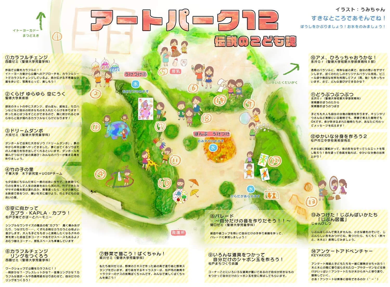今回は、12のワークショップが公園各所で行われました。学内からは児童学科のゼミ(大成ゼミ、関口ゼミ、西園ゼミ、祓川ゼミ)や美術部、保育科(北沢Gr、永井Gr)から2団体が参加しました。保育園きぼうのたから・つばさ、クリエイティブまつど工房、じゅんびしつ、子育てハーモニー、松戸まちづくり会議等地域団体も、楽しい企画を実施しました。