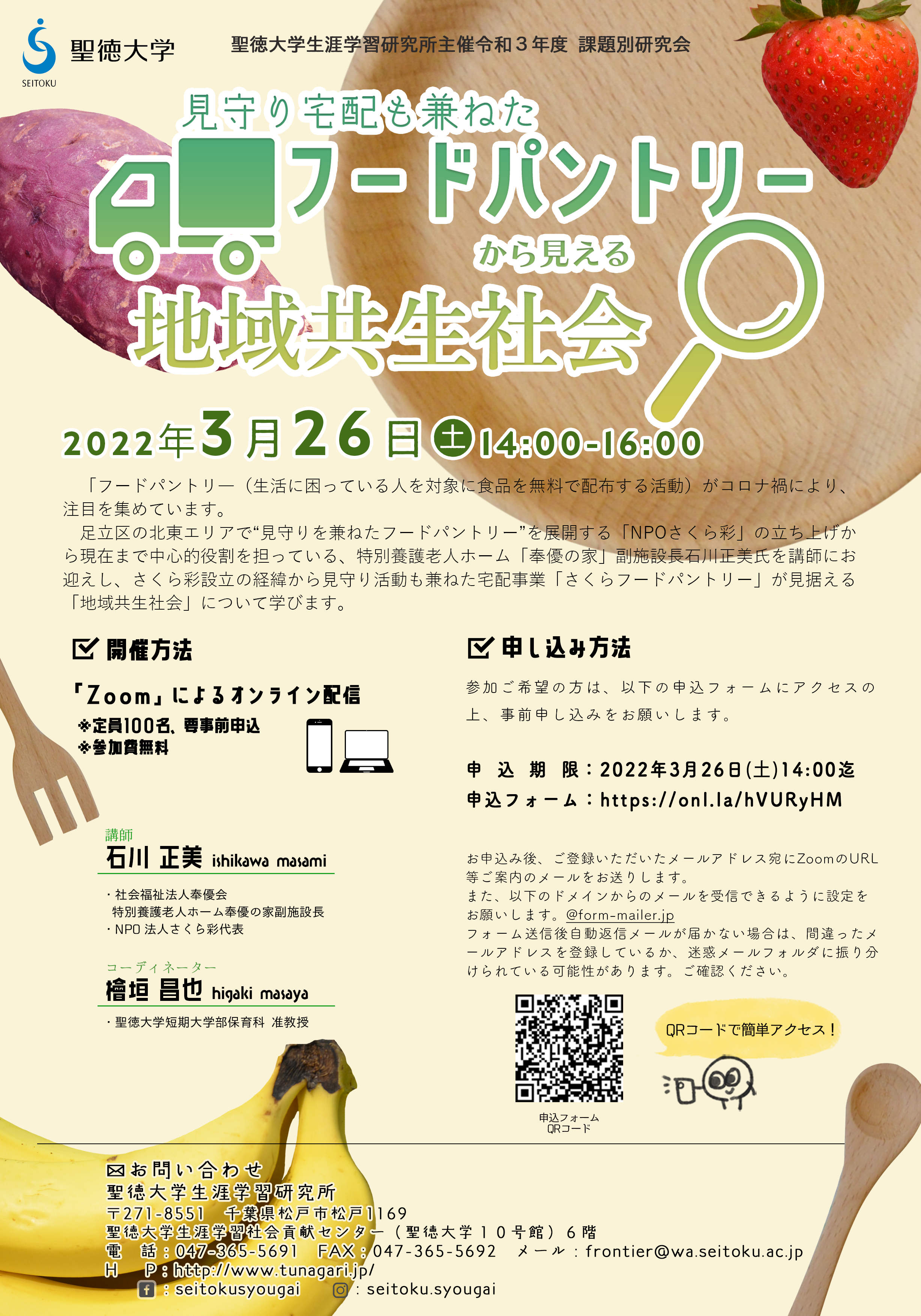 足立区の北東エリアで“見守りを兼ねたフードパントリー”を展開するNPO法人「さくら彩」の立ち上げから現在まで中心的役割を担っている、社会福祉法人奉優会特別養護老人ホーム奉優の家副施設長石川正美氏を講師にお迎えし、さくら彩設立の経緯から見守り活動も兼ねた宅配事業「さくらフードパントリー」が見据える「地域共生社会」について学びます。